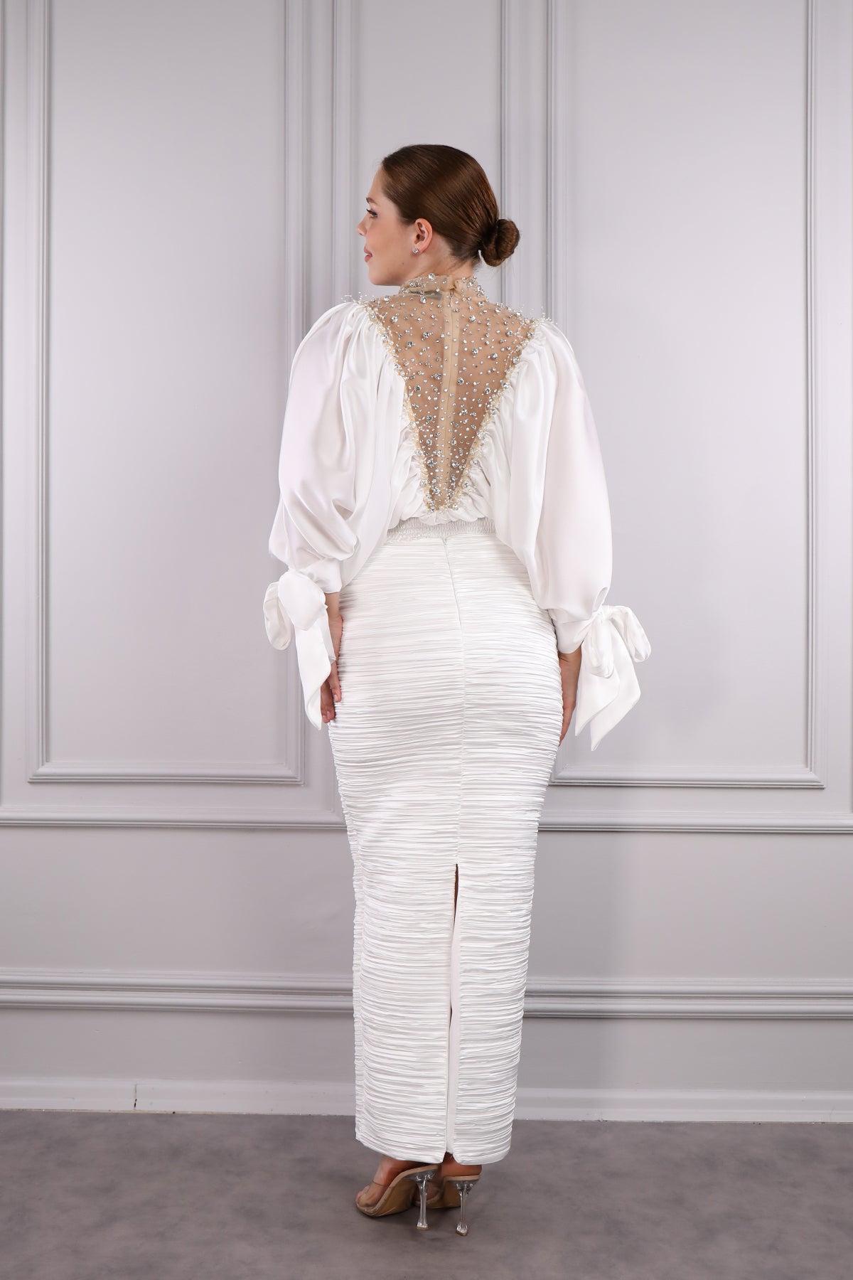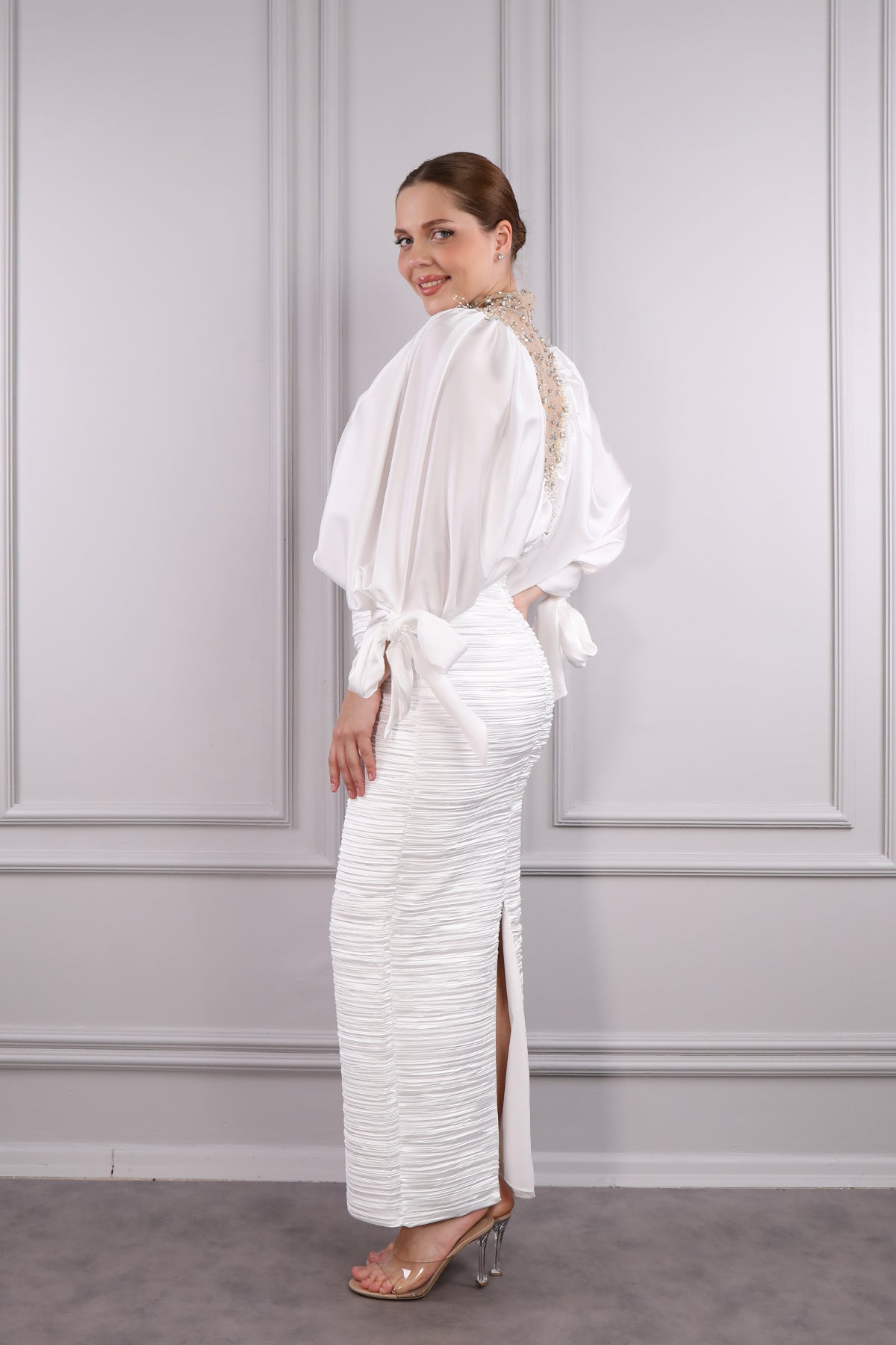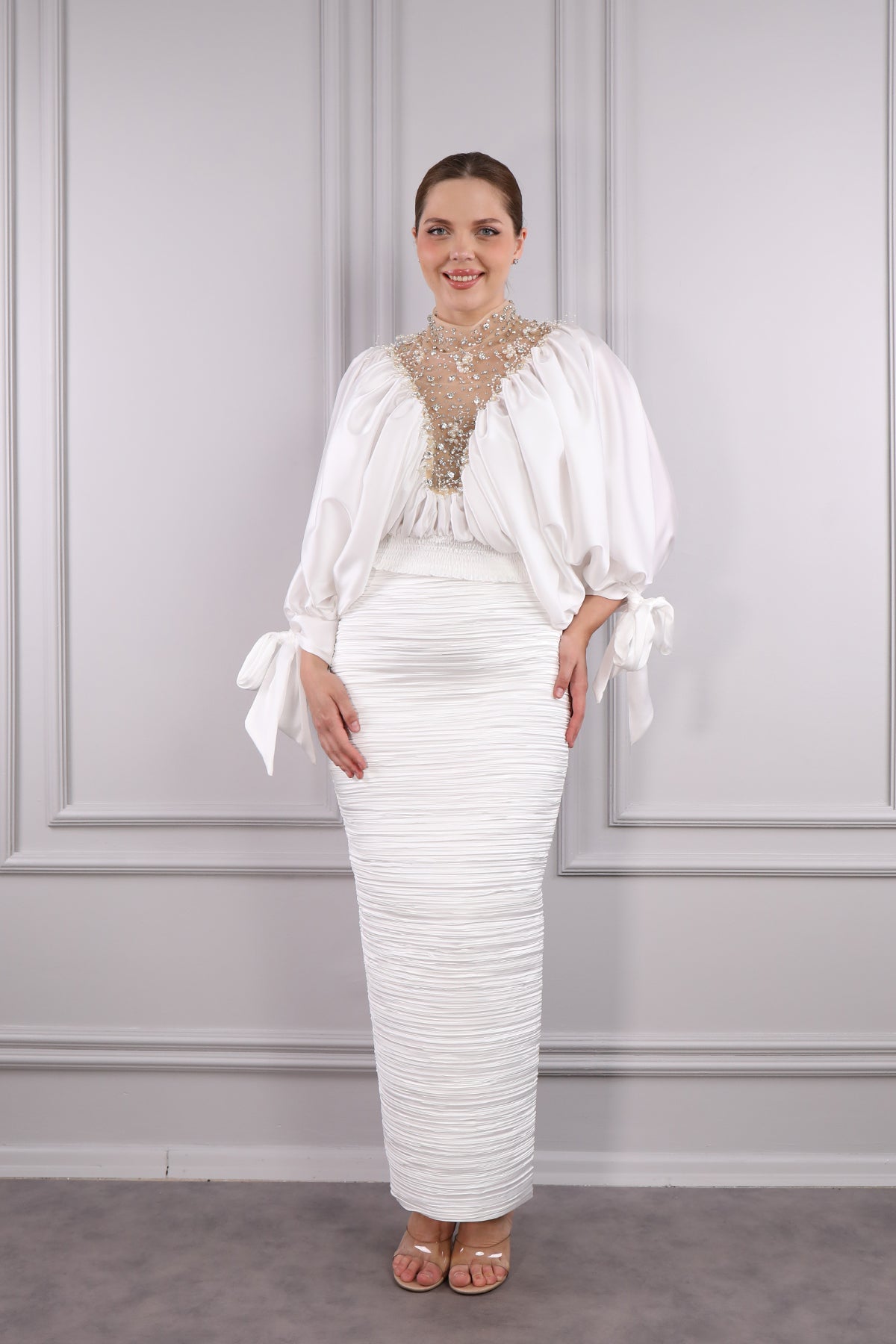 Hakim yakası dekolte kısmına doğru dekolte oluştururken tül kumaşla kapatılarak inci ve taşlarla işlenerek süslenmiştir. Balon kesim kolları bileklerine doğru daralarak fiyonk detayıyla hareketlendirilmiştir. Takımın parçası olan eteğine tamamen drape görünümü verilirken arka eteğine verilen yırtmaçla detaylandırılmıştır. Özel günlerinizde ayrı parçalar olarakta kullanabileceğiniz etek takımımızı tercih etmeniz sizler için şık bir seçim olacaktır.