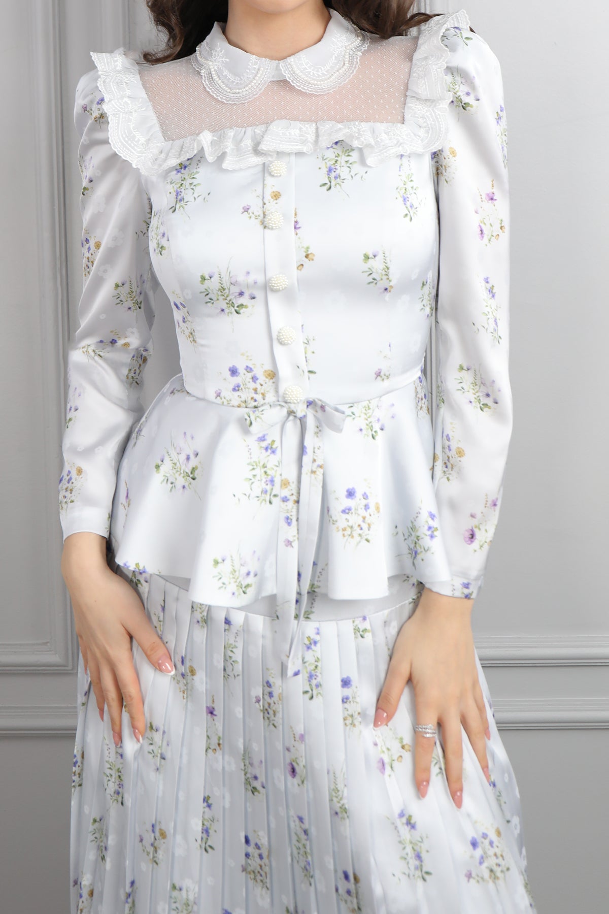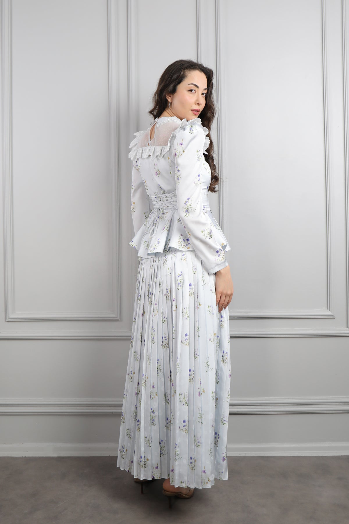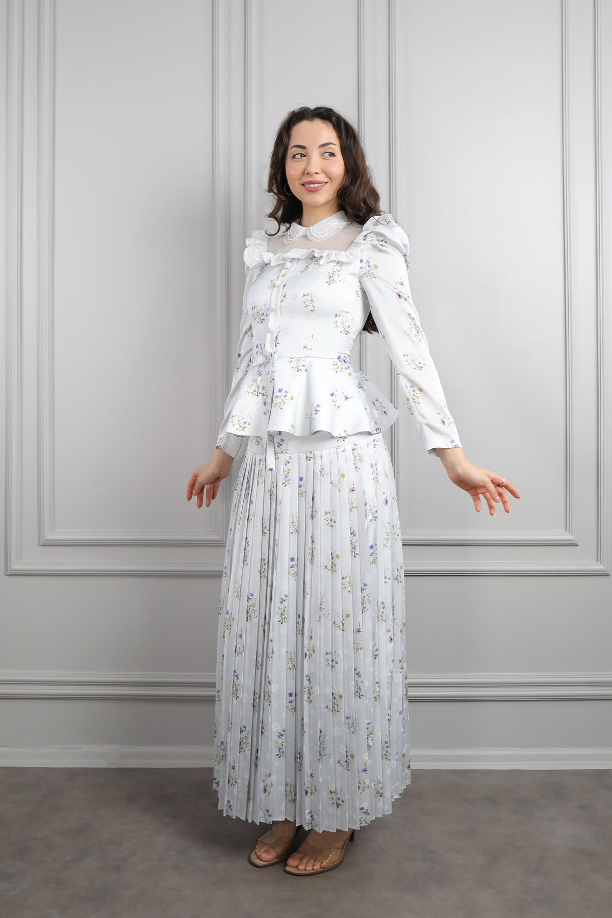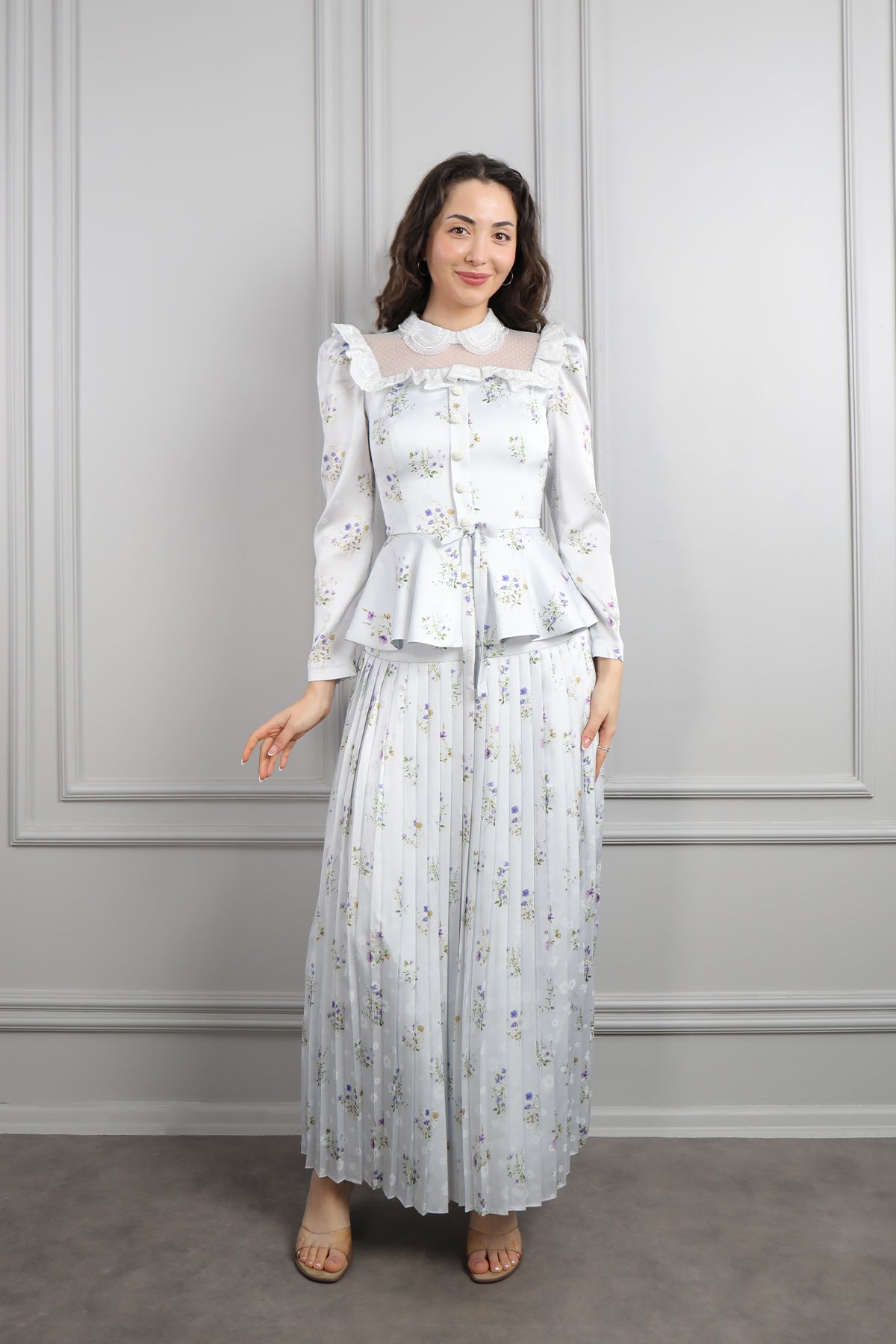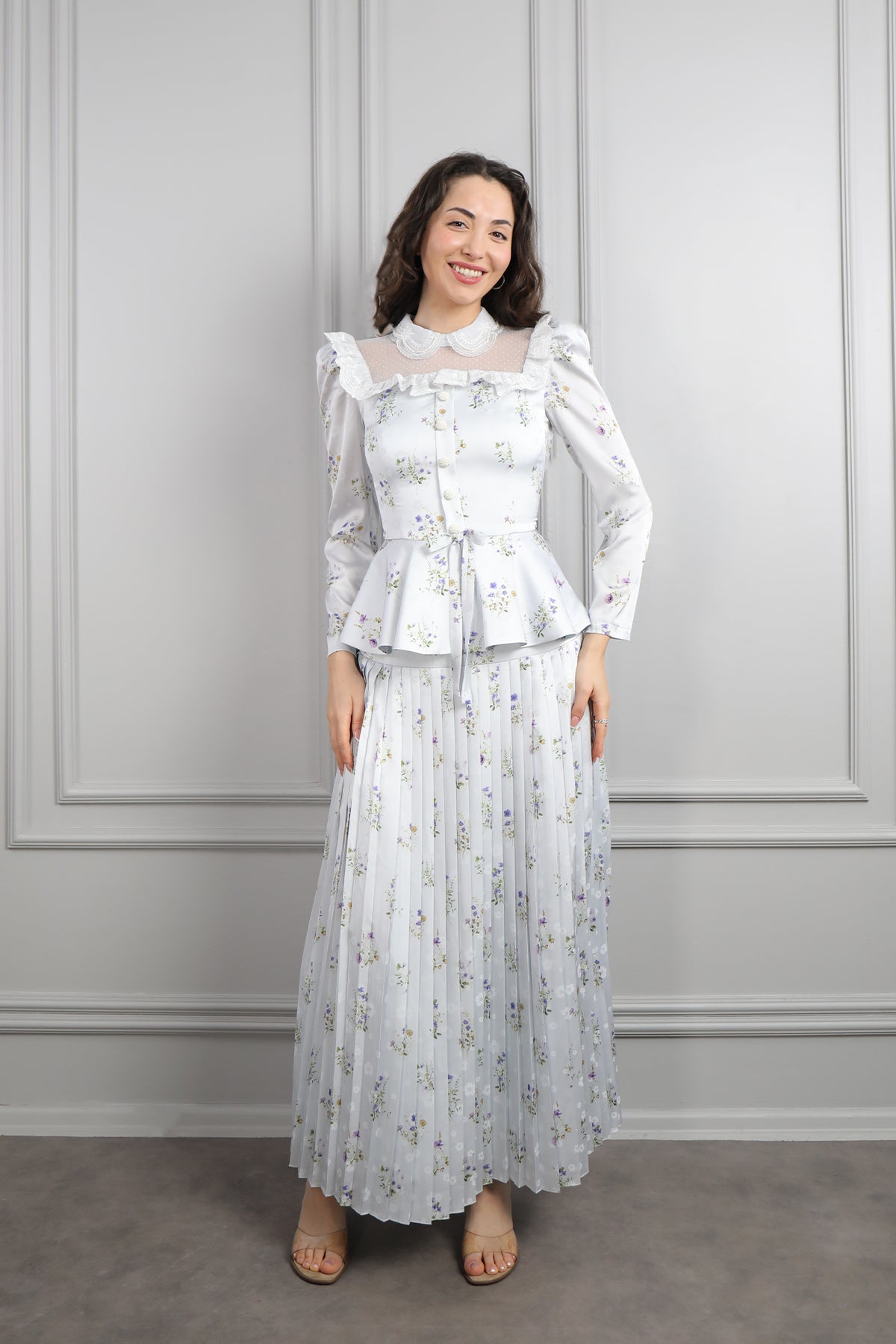 Yakası Transparan Beli Fiyonk Detaylı Desenli Saten Pileli Etek Takım Mavi Özellikleri
