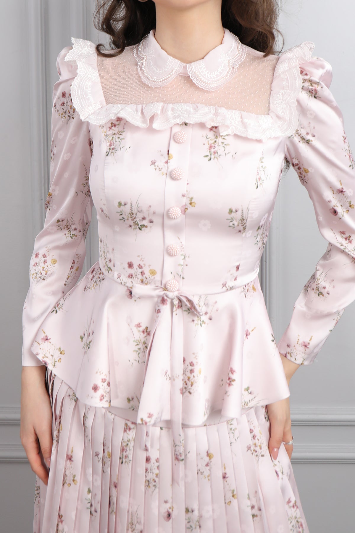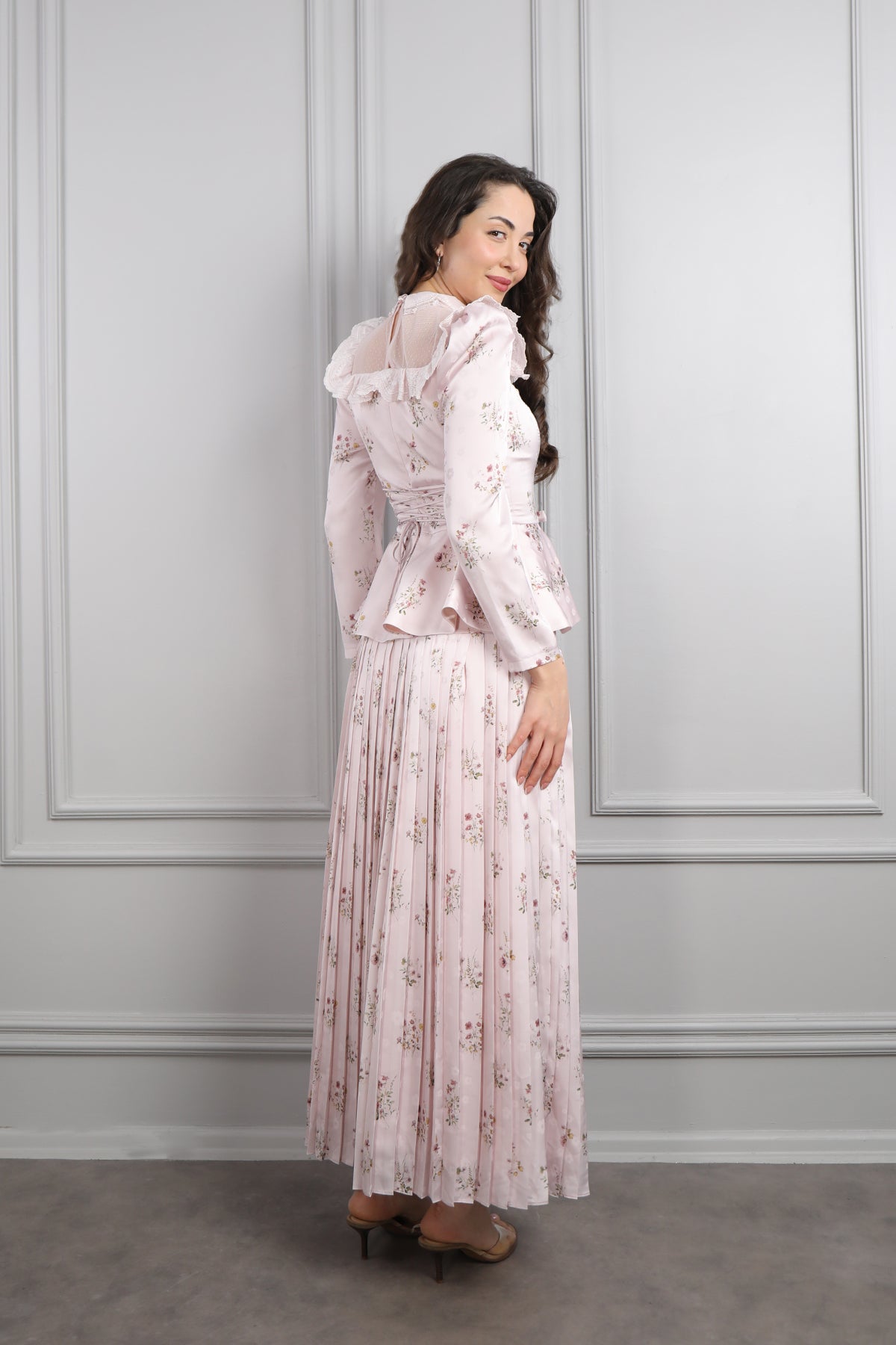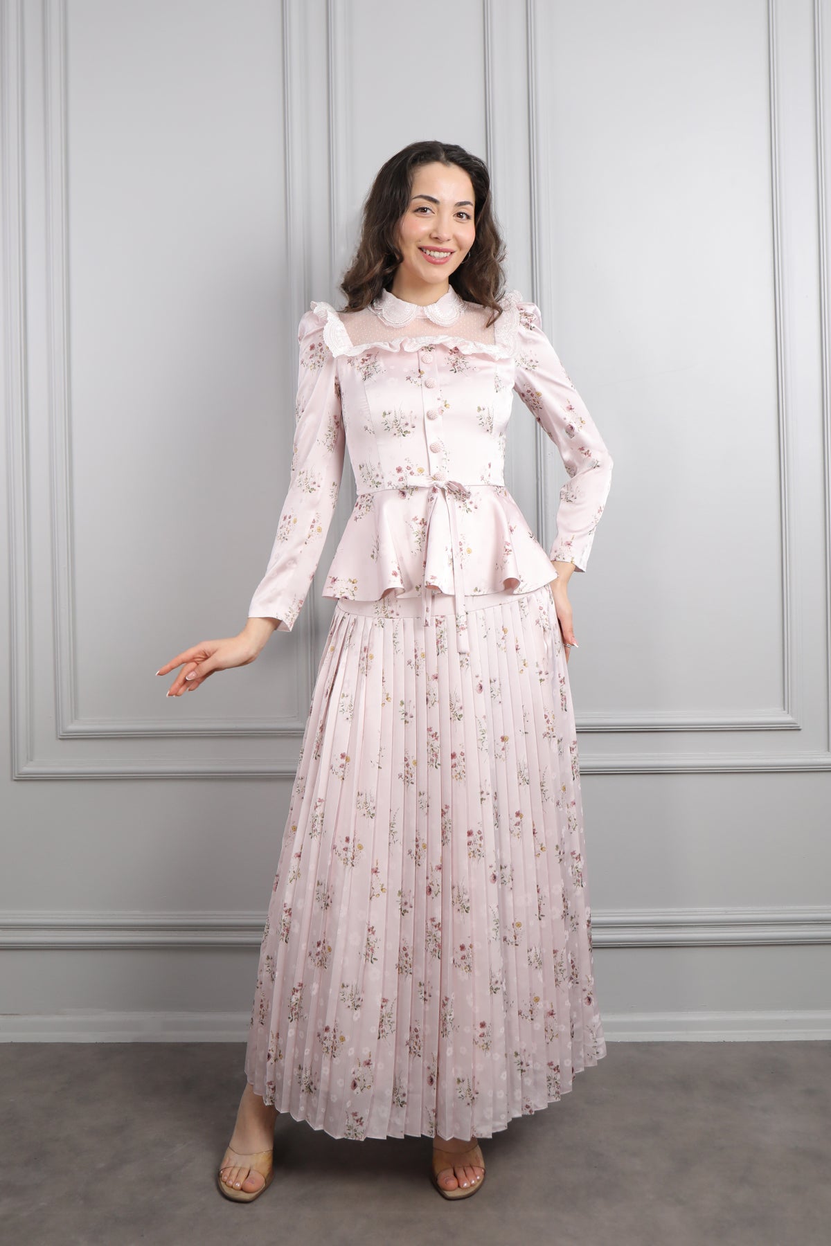 Yakası Transparan Beli Fiyonk Detaylı Desenli Saten Pileli Etek Takım Pudra Özellikleri
