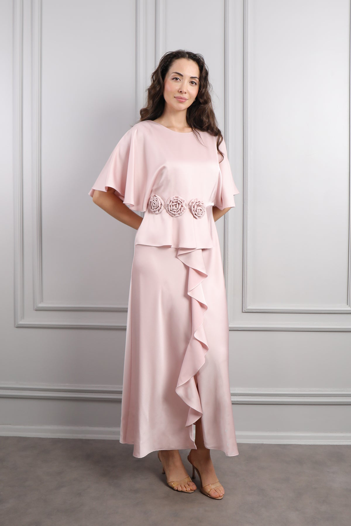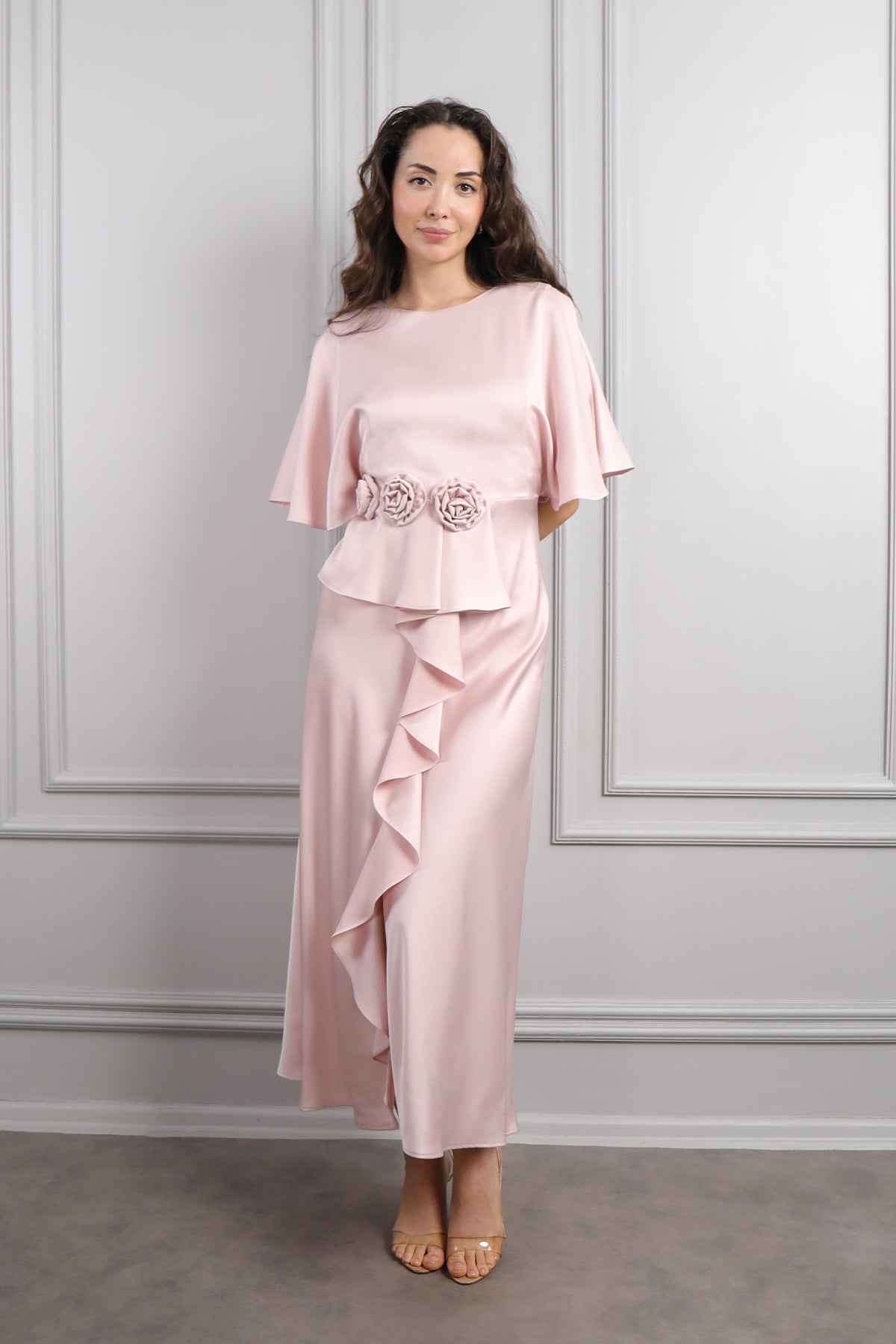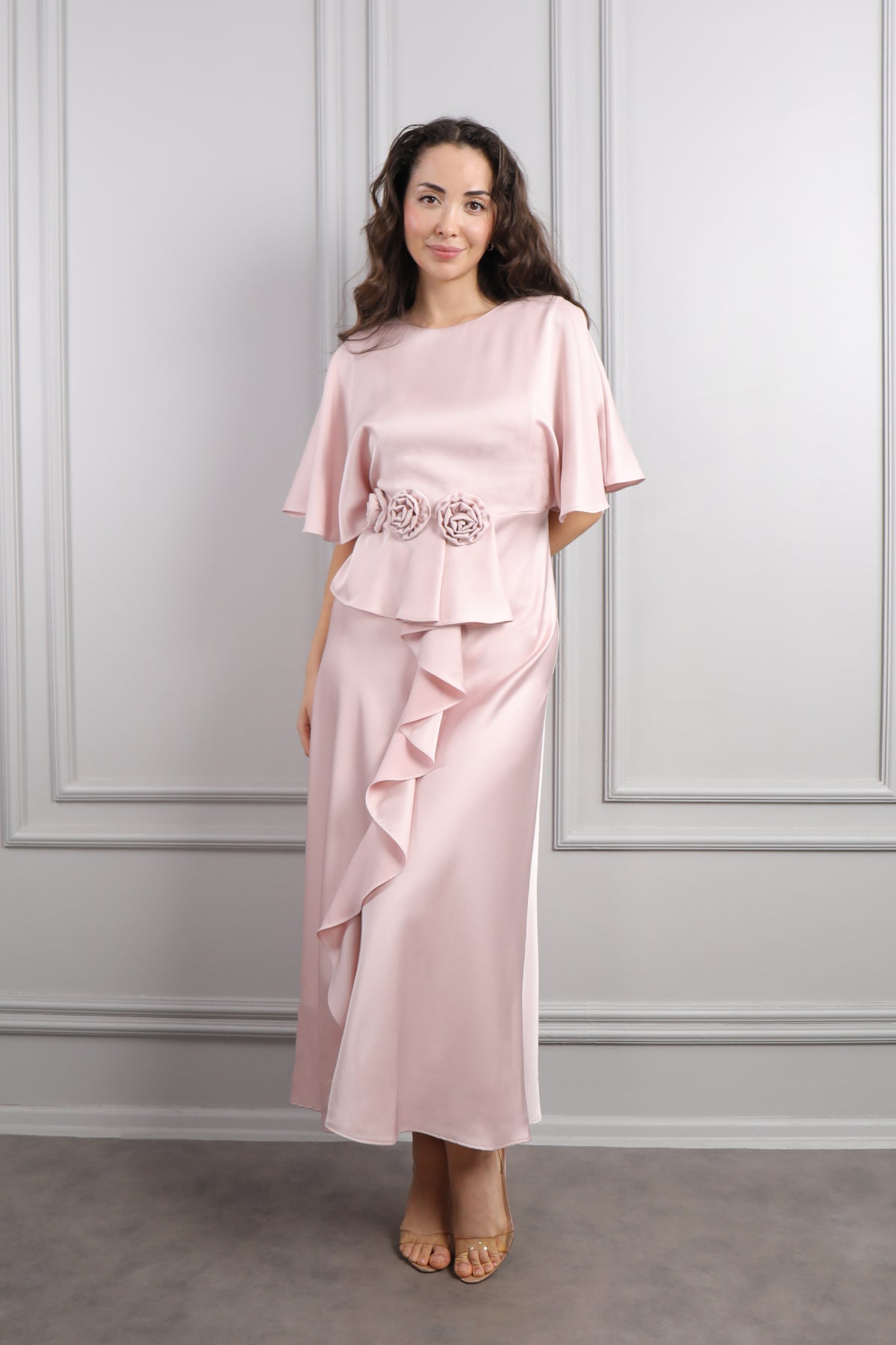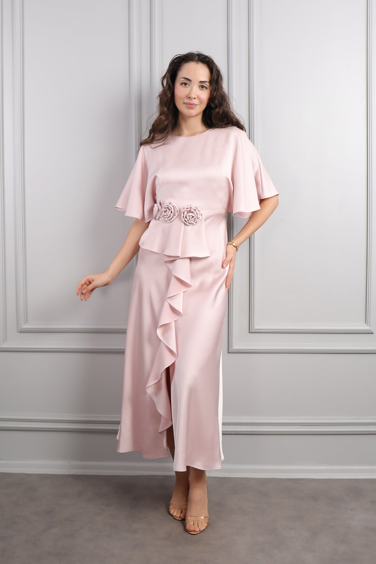 Yarasa Kol Beli Çiçek Detaylı Fırfırlı Büyük Beden Midi Boy Saten Elbise Pudra