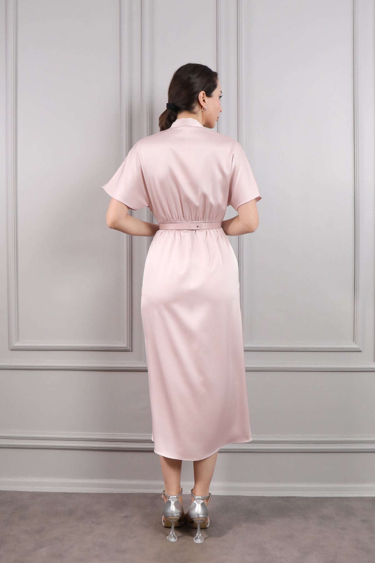 Yarasa Kol Beli Kemerli Midi Boy Saten Elbise Özellikleri