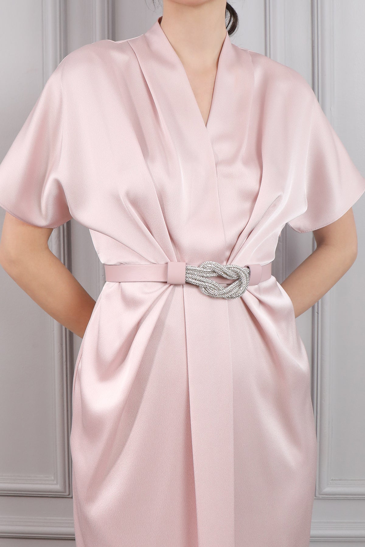 Kısa yarasa kol elbisemizin tamamı saten kumaş kullanılarak tasarlanırken belini saran taş detaylı kemer aksesuarıyla göz alıcı görünüme sahiptir. Midi boy eteğine verilen asimetrik kesimle hareketlendirilirken özel günlerinizde tercih etmeniz sizler için ideal bir seçim olacaktır.