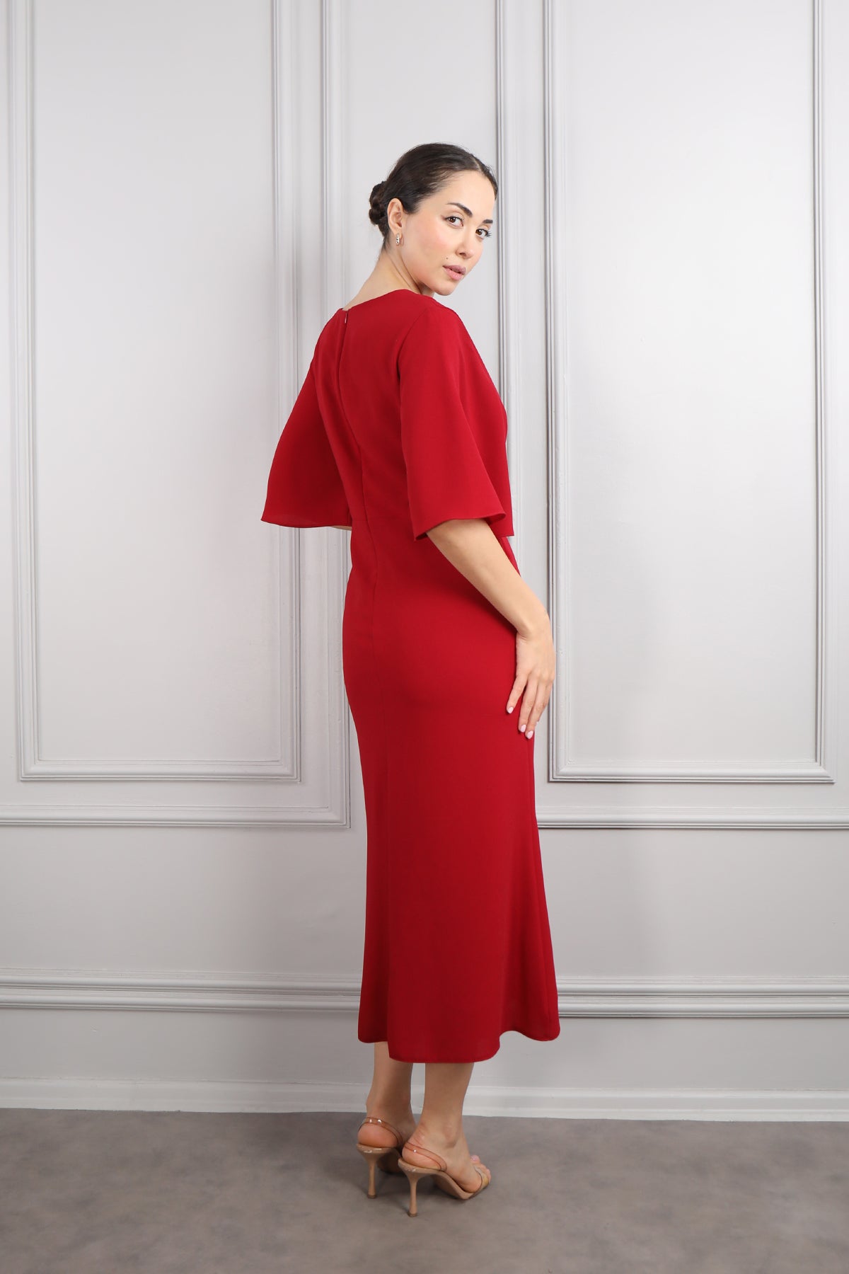Zamansız şıklığı konforla buluşturan Yarasa Kol Boncuk İşlemeli Elbise, zarif tasarımı ve göz alıcı detaylarıyla özel günlerde stilinizi ön plana çıkarıyor. yarasa kol detayı sayesinde hareket özgürlüğü sağlarken aynı zamanda modern ve dökümlü bir siluet oluşturuyor. Göğüs kısmındaki çapraz drapeler vücut hatlarını zarifçe şekillendirirken, bel bölgesindeki boncuk işlemeli çiçek detayları feminen bir dokunuş katıyor. Midi boy kesimiyle hem rahat hem de şık bir duruş elde edilirken, akıcı kumaşı gün boyu konfor sunuyor. Düğün, nişan, özel gün veya davetlerinizde tercih etmeniz sizler için ideal bir seçim olacaktır.