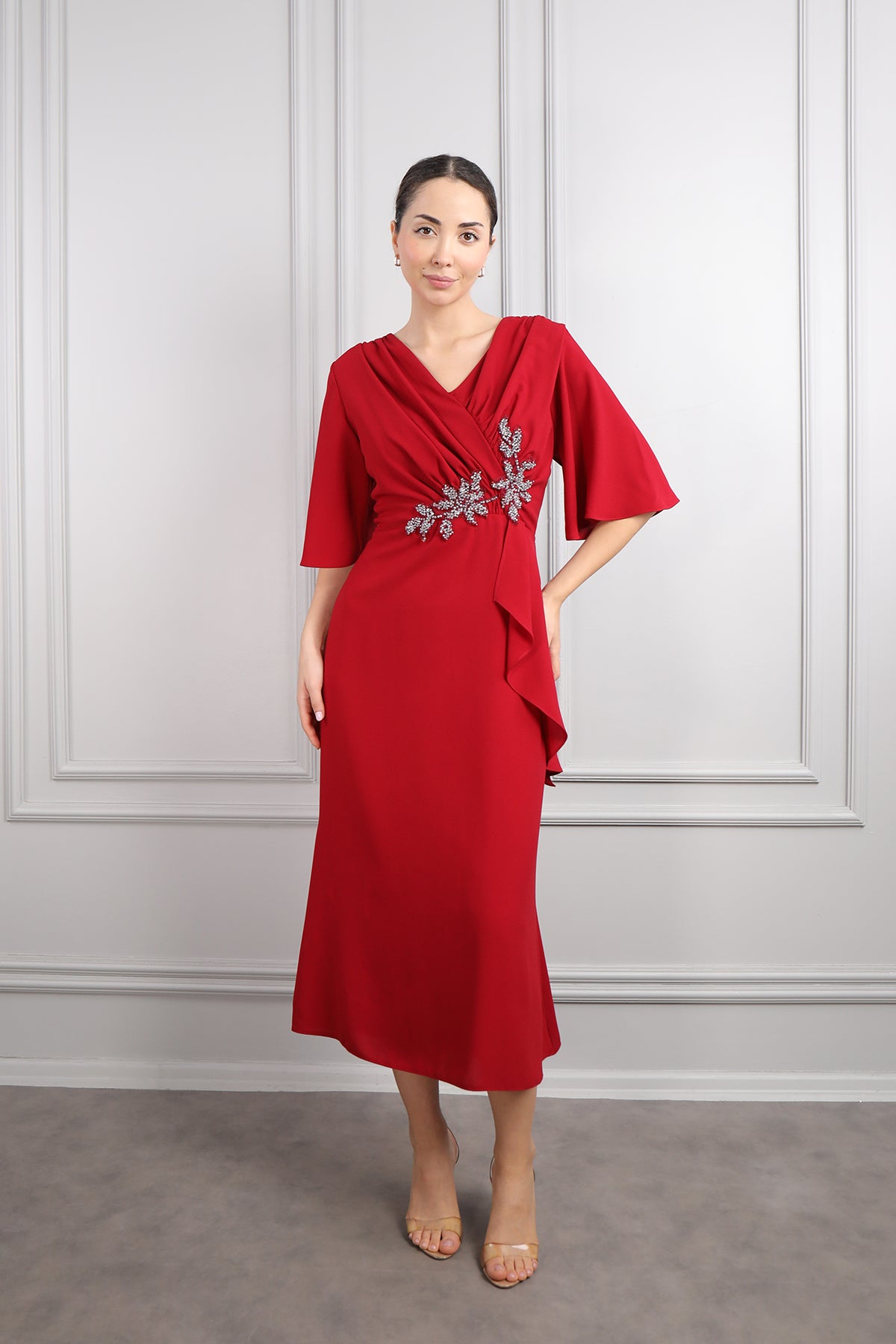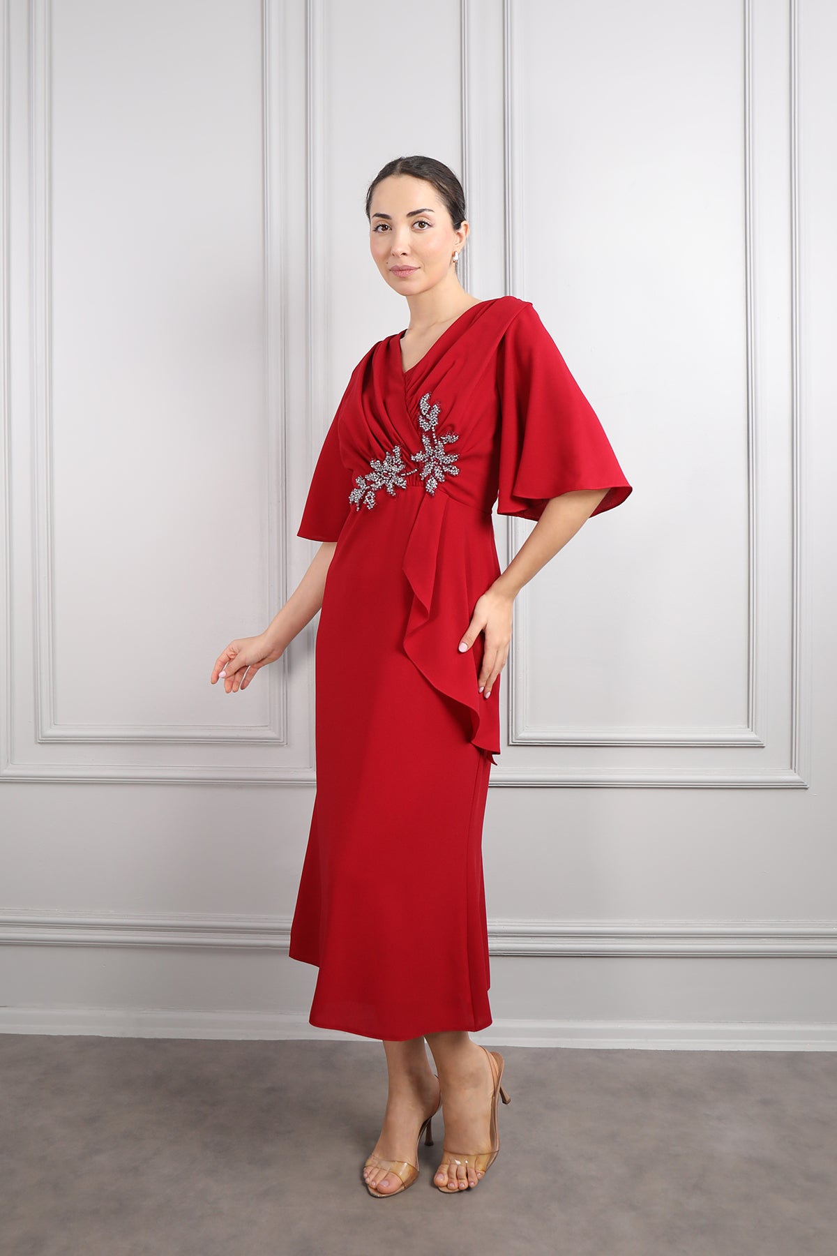 Yarasa Kol Boncuk İşlemeli Büyük Beden Midi Boy Elbise Bordo Özellikleri