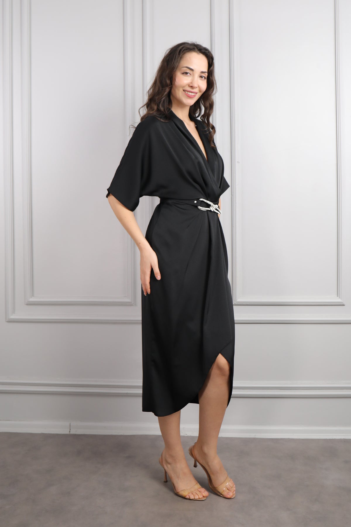 Yarasa Kol Kemeri Taş İşlemeli Midi Boy Büyük Beden Saten Elbise Siyah