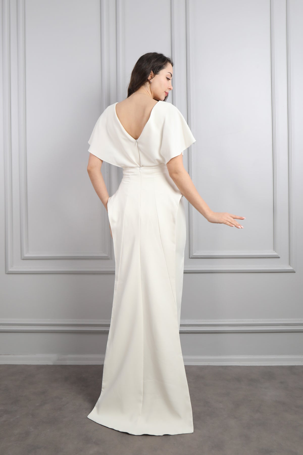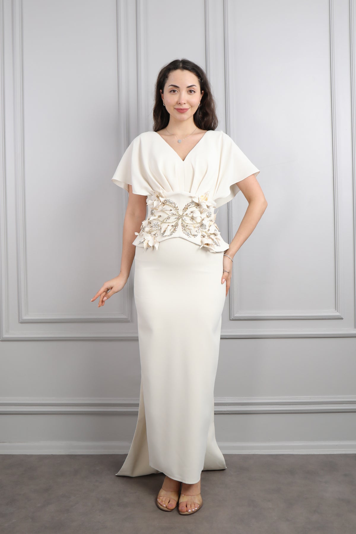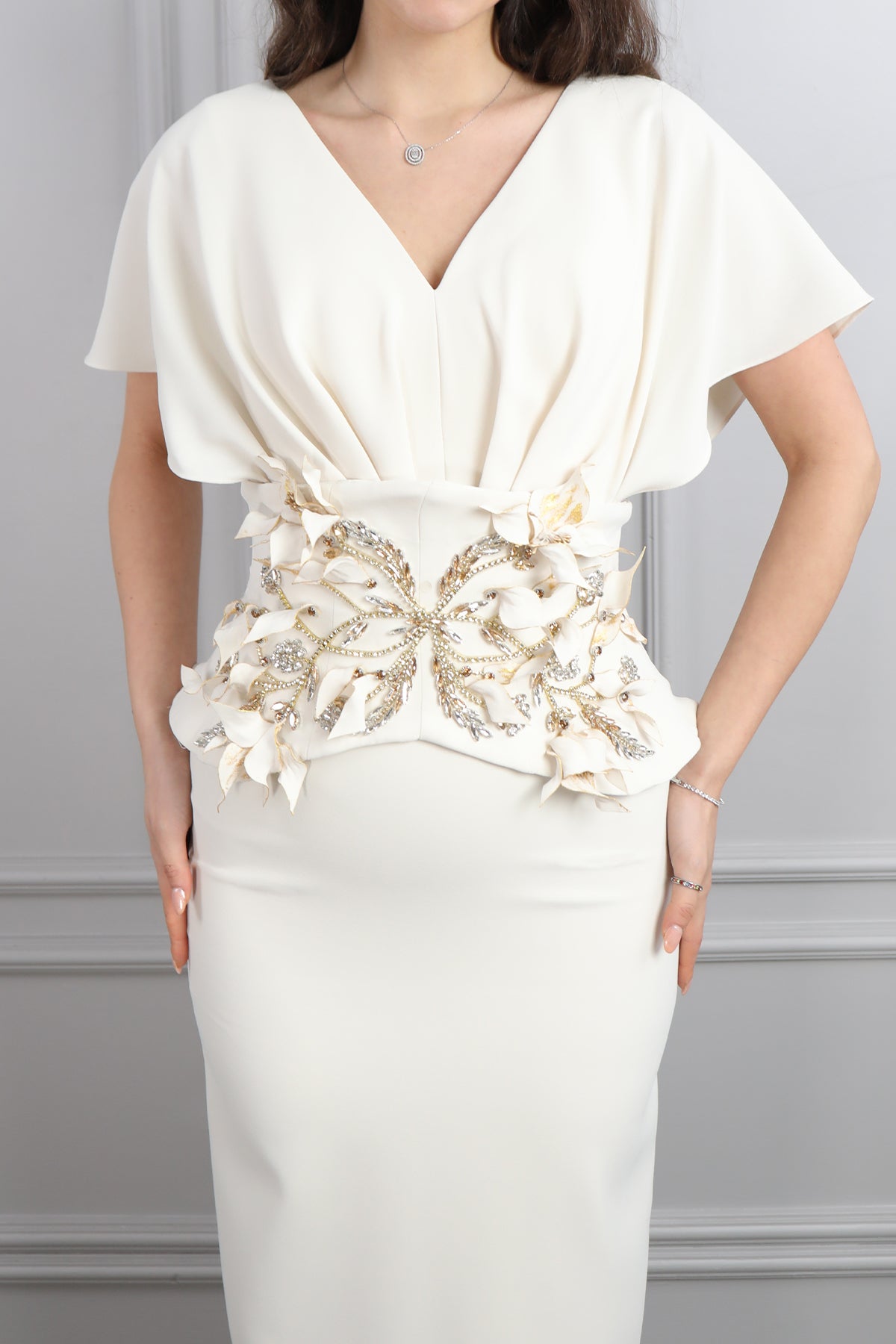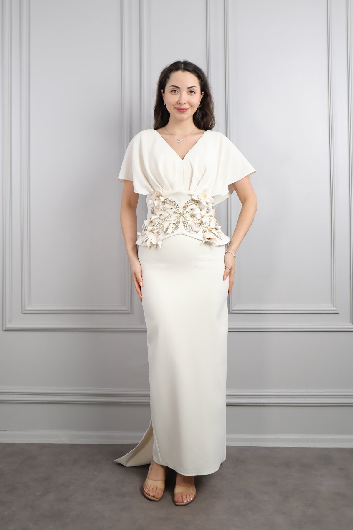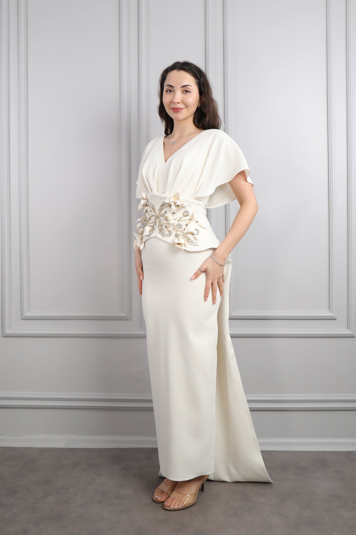Yarasa Kol Taş İşlemeli Korsesi Pelerin Detaylı Abiye Bej
